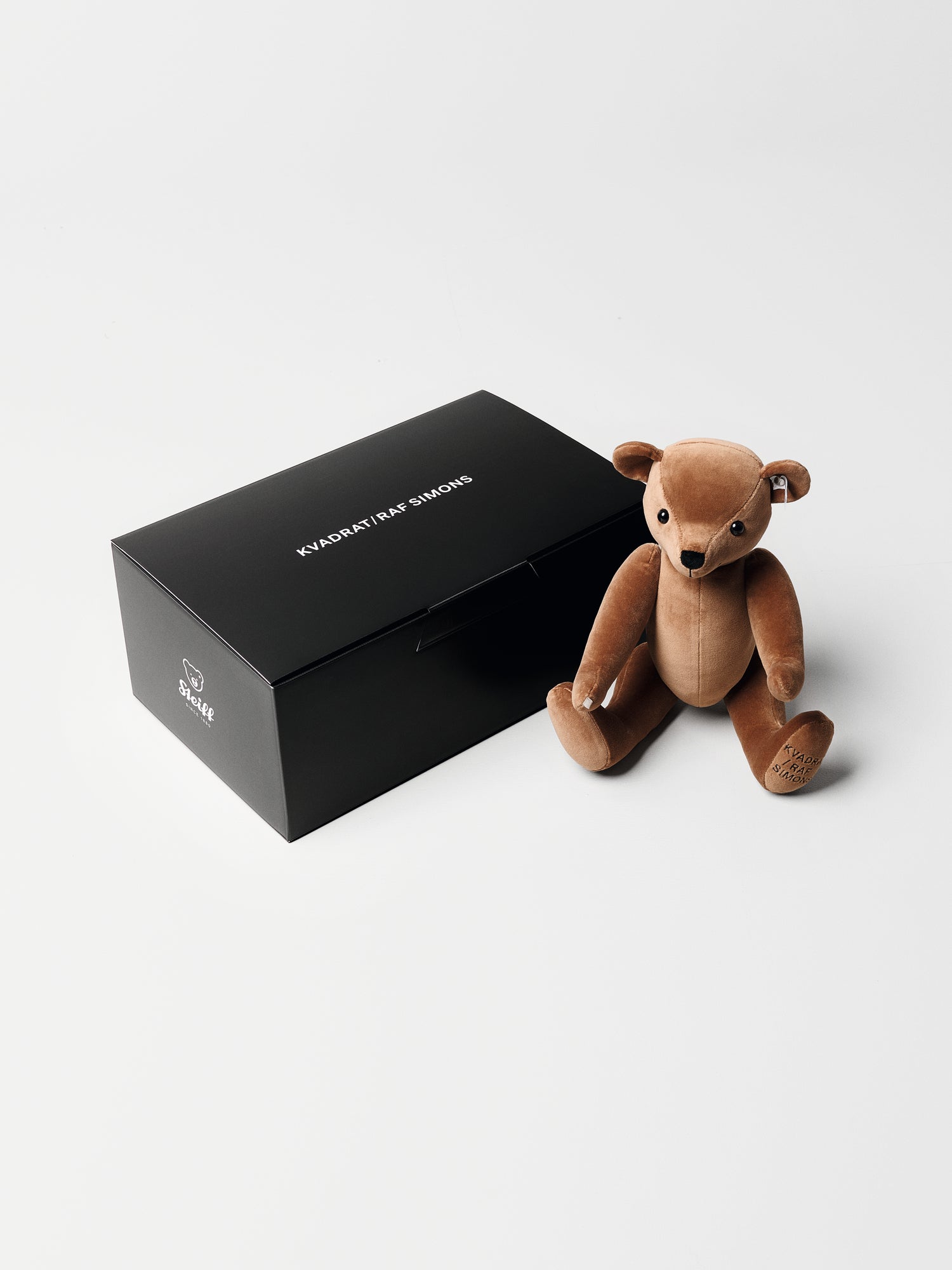A hand-made teddy bear in Asator velvet, created in collaboration with Steiff. Each bear has its own subtle character and carries a Kvadrat/Raf Simons logo on the foot and the classic Steiff button on the ear.