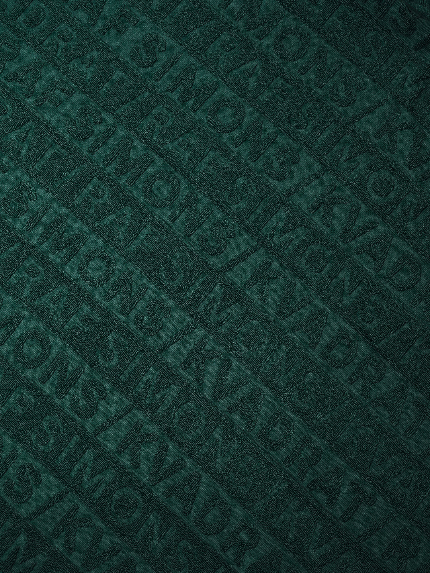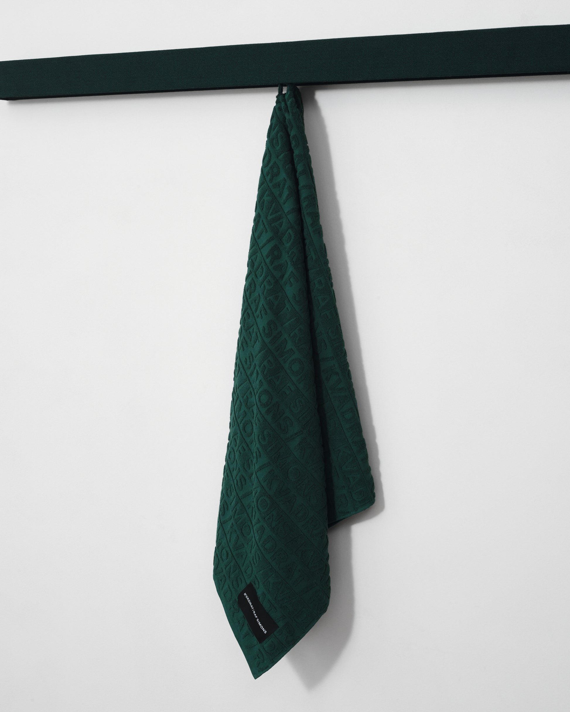 A towel in terry cloth with a Kvadrat/Raf Simons logo in the jacquard pattern. Generously sized for wrapping the whole body.