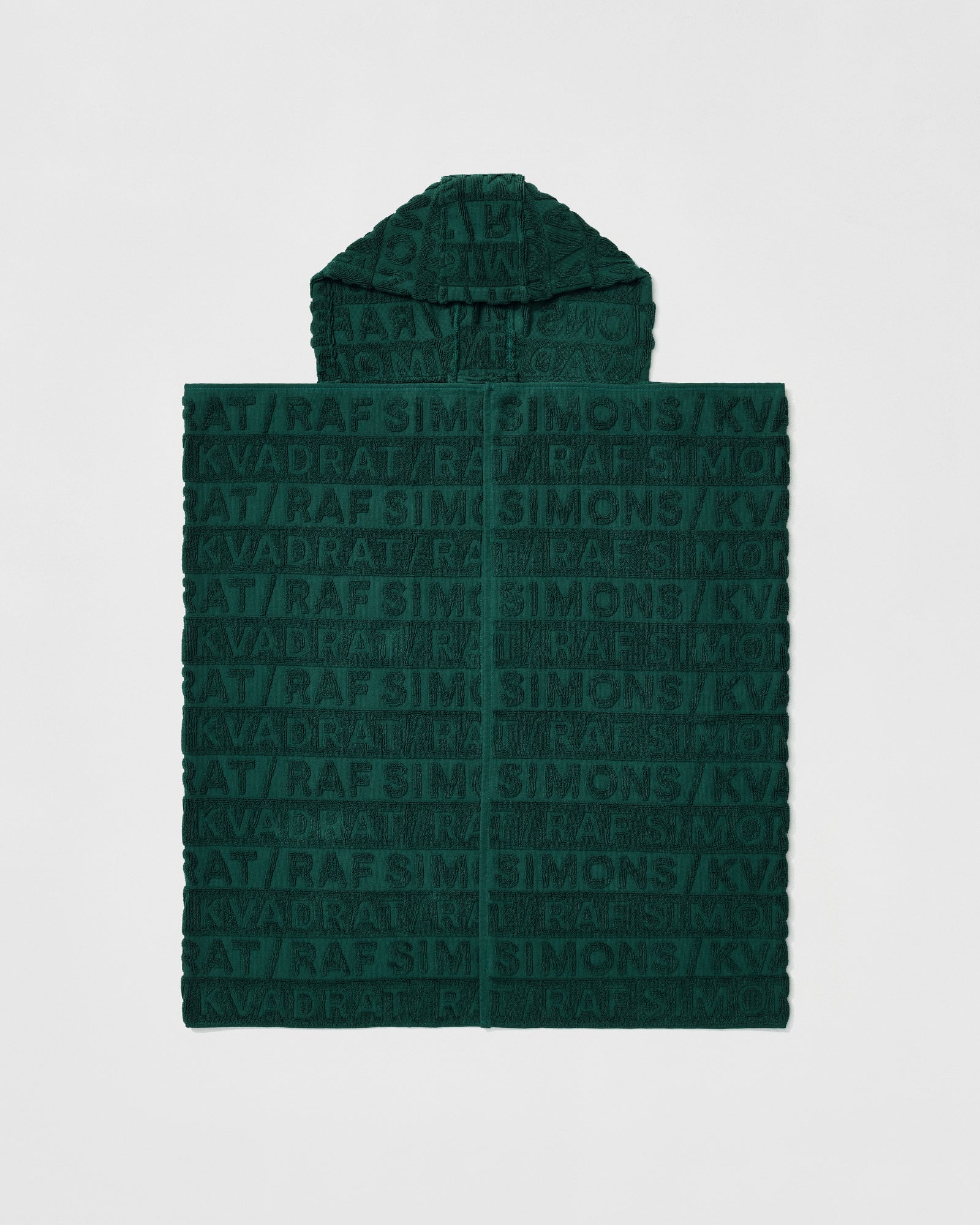 The hooded towel is made from soft terry cotton and finished with a jacquard Kvadrat/Raf Simons logo. Sized for children, it is absorbent and comfortable, making it ideal for bath time, beach days, or swimming lessons.