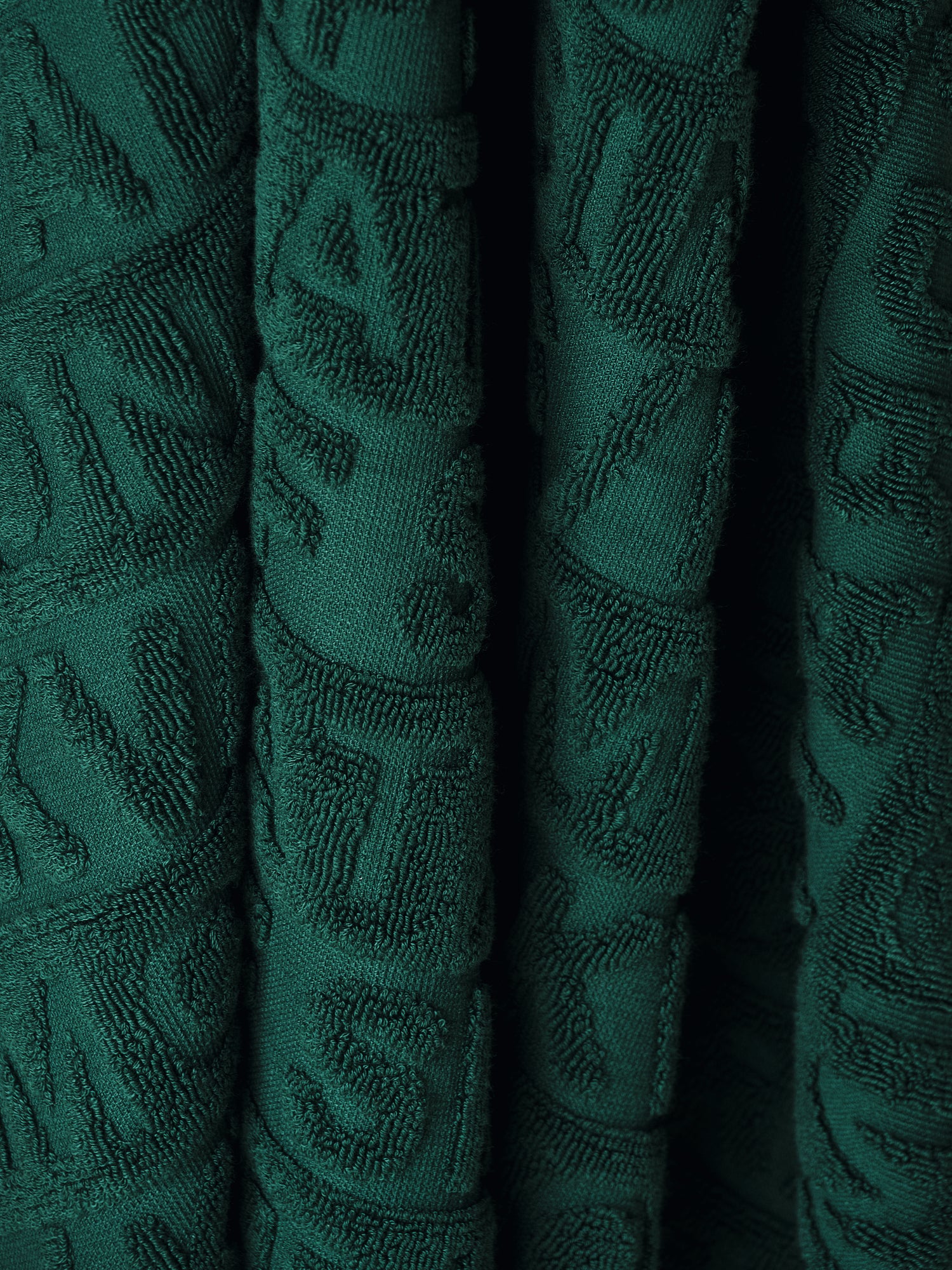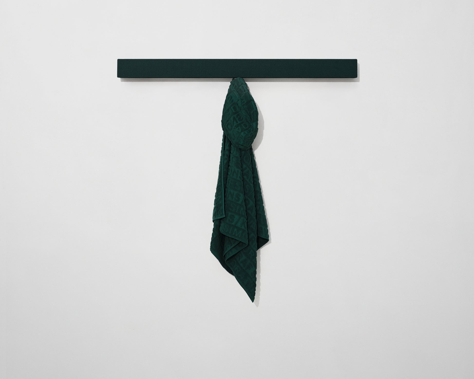 The design includes a hanging loop and a branded label, blending function with understated detail. Available in dark green and off-white, it offers a natural extension of the bathroom collection.