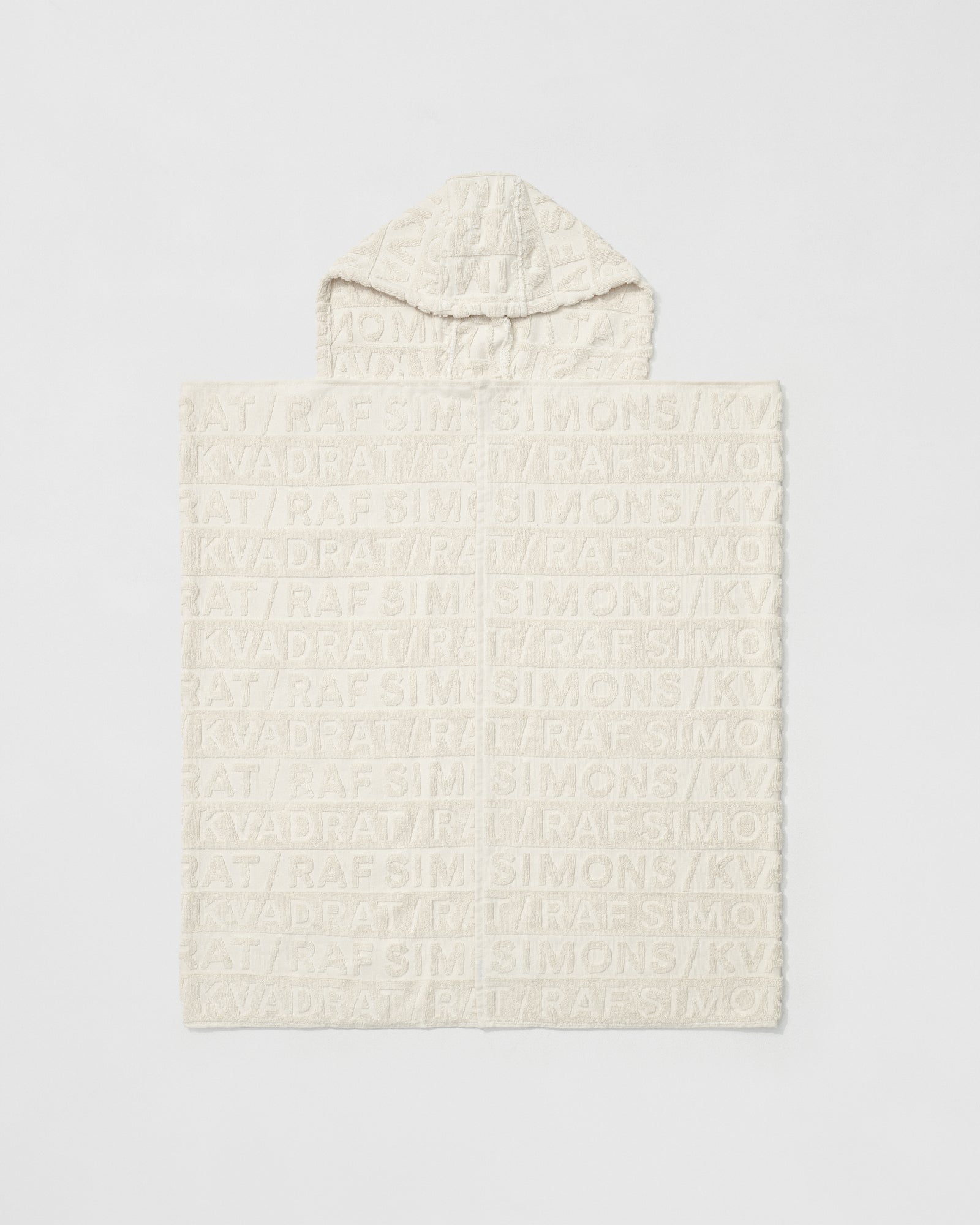 The hooded towel is made from soft terry cotton and finished with a jacquard Kvadrat/Raf Simons logo. Sized for children, it is absorbent and comfortable, making it ideal for bath time, beach days, or swimming lessons.