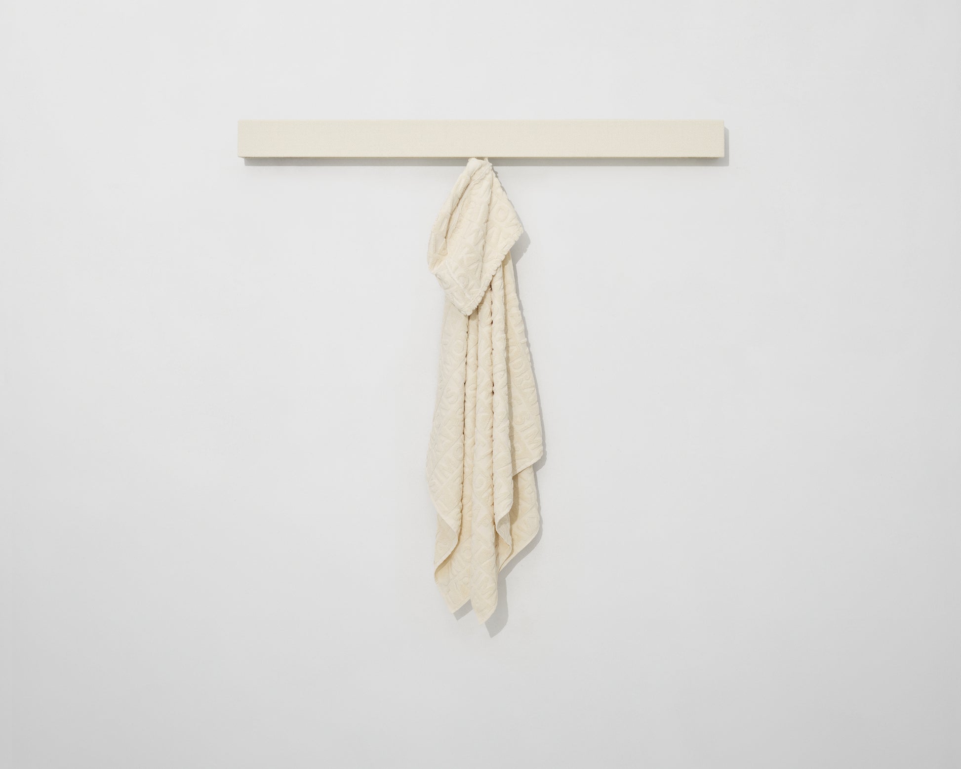The design includes a hanging loop and a branded label, blending function with understated detail. Available in dark green and off-white, it offers a natural extension of the bathroom collection.