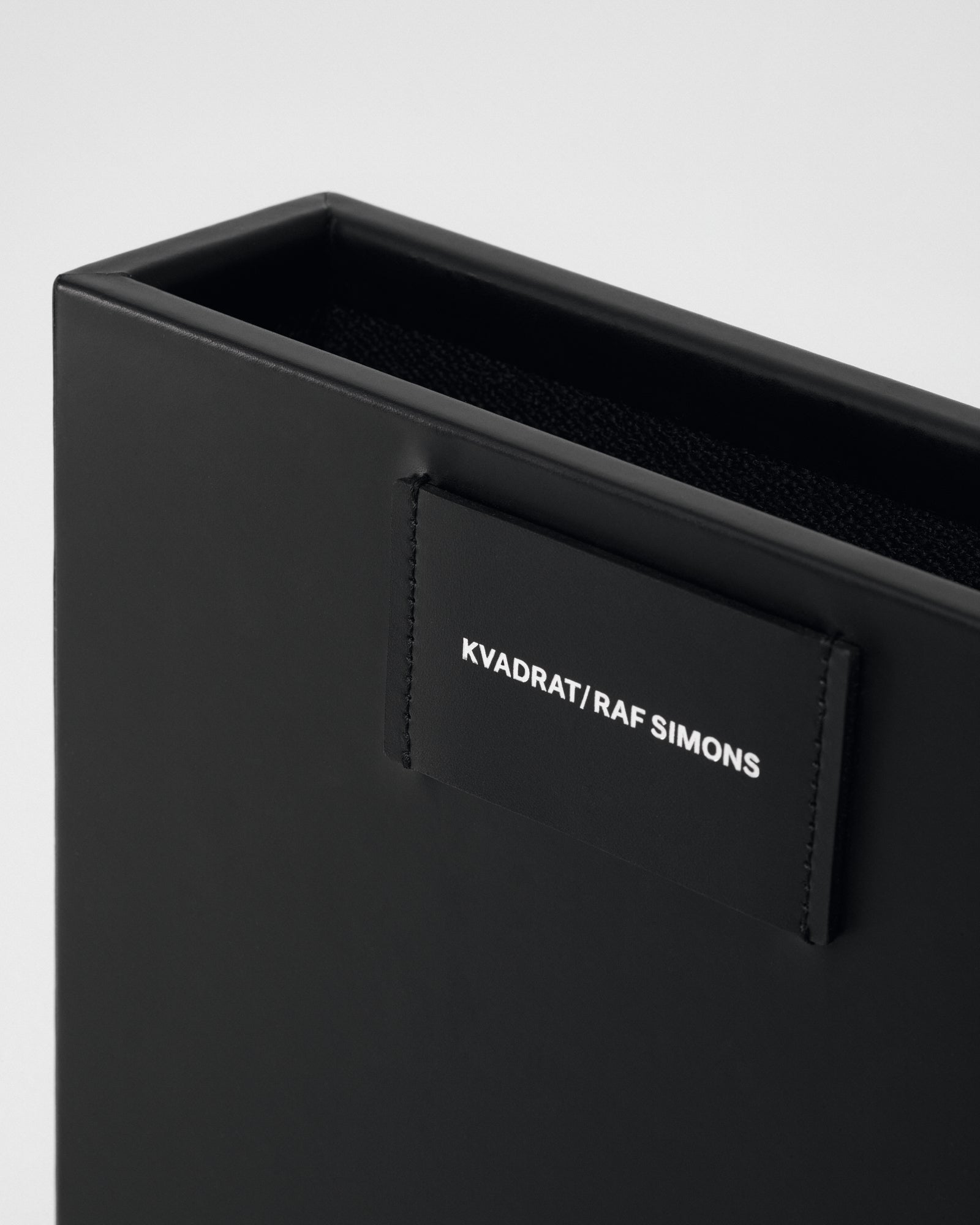 An accessory box with a leather-clad wooden frame and interior lined in Vidar 4. A leather label stitched on the rear is used to mount the box on the universal strap. Together they have a simple geometric expression. Versatile and functional, the accessory box can also be used freestanding as a receptacle for papers or pens. It has a silver foil Kvadrat/Raf Simons logo debossed in the leather label.