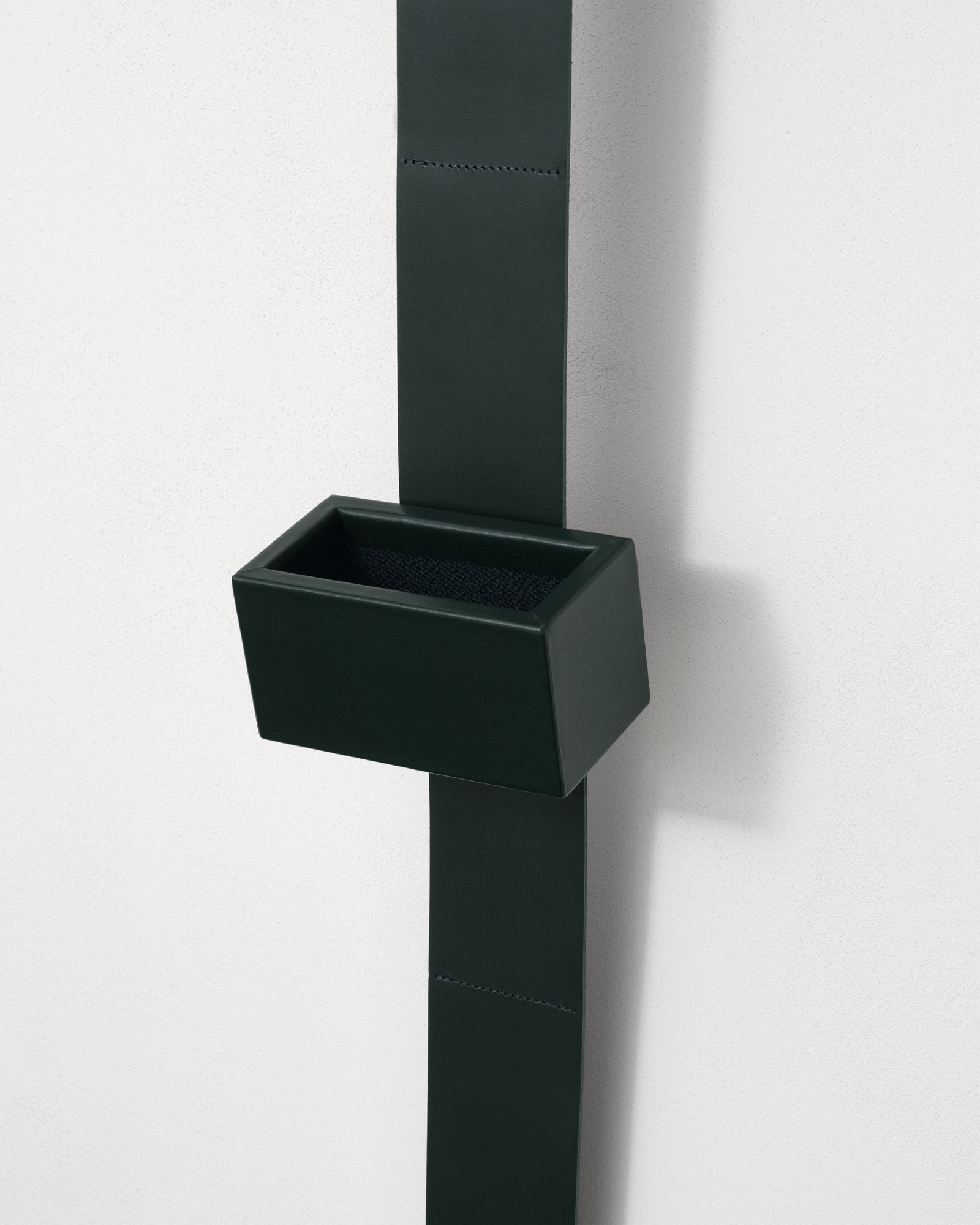An accessory box with a leather-clad wooden frame and interior lined in Vidar 4. A leather label stitched on the rear is used to mount the box on the universal strap. Together they have a simple geometric expression. Versatile and functional, the accessory box can also be used freestanding as a receptacle for papers or pens. It has a silver foil Kvadrat/Raf Simons logo debossed in the leather label.