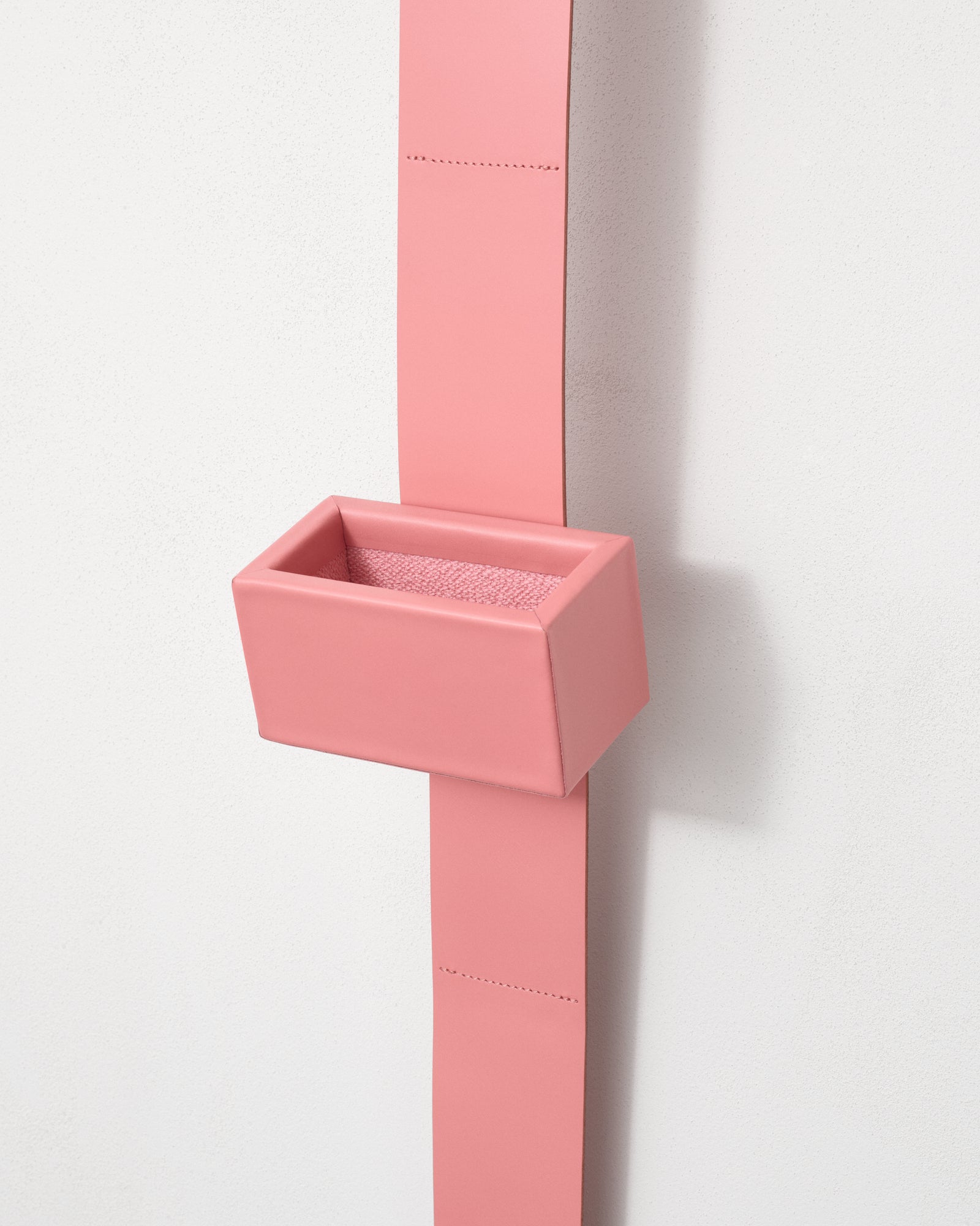 An accessory box with a leather-clad wooden frame and interior lined in Vidar 4. A leather label stitched on the rear is used to mount the box on the universal strap. Together they have a simple geometric expression. Versatile and functional, the accessory box can also be used freestanding as a receptacle for papers or pens. It has a silver foil Kvadrat/Raf Simons logo debossed in the leather label.