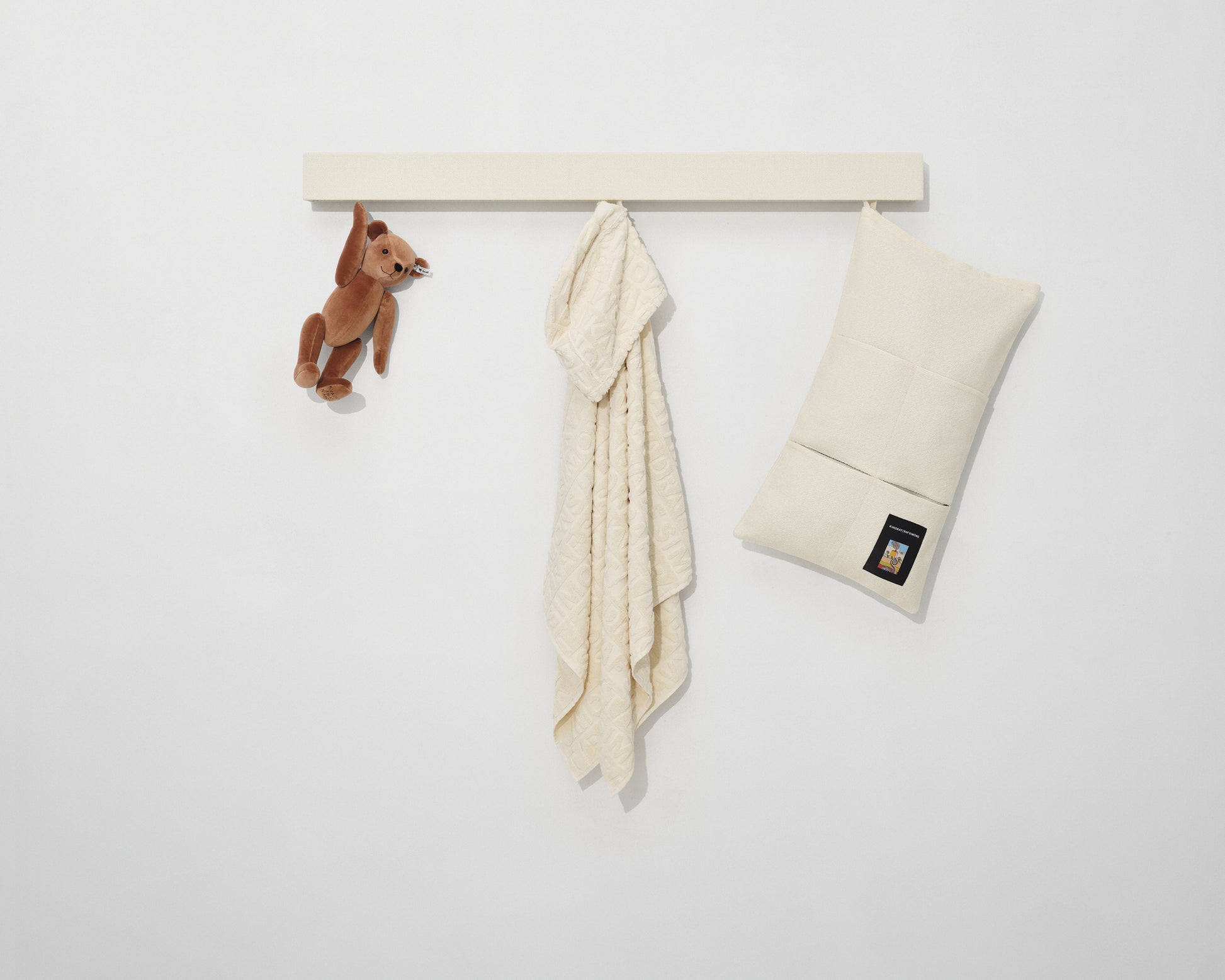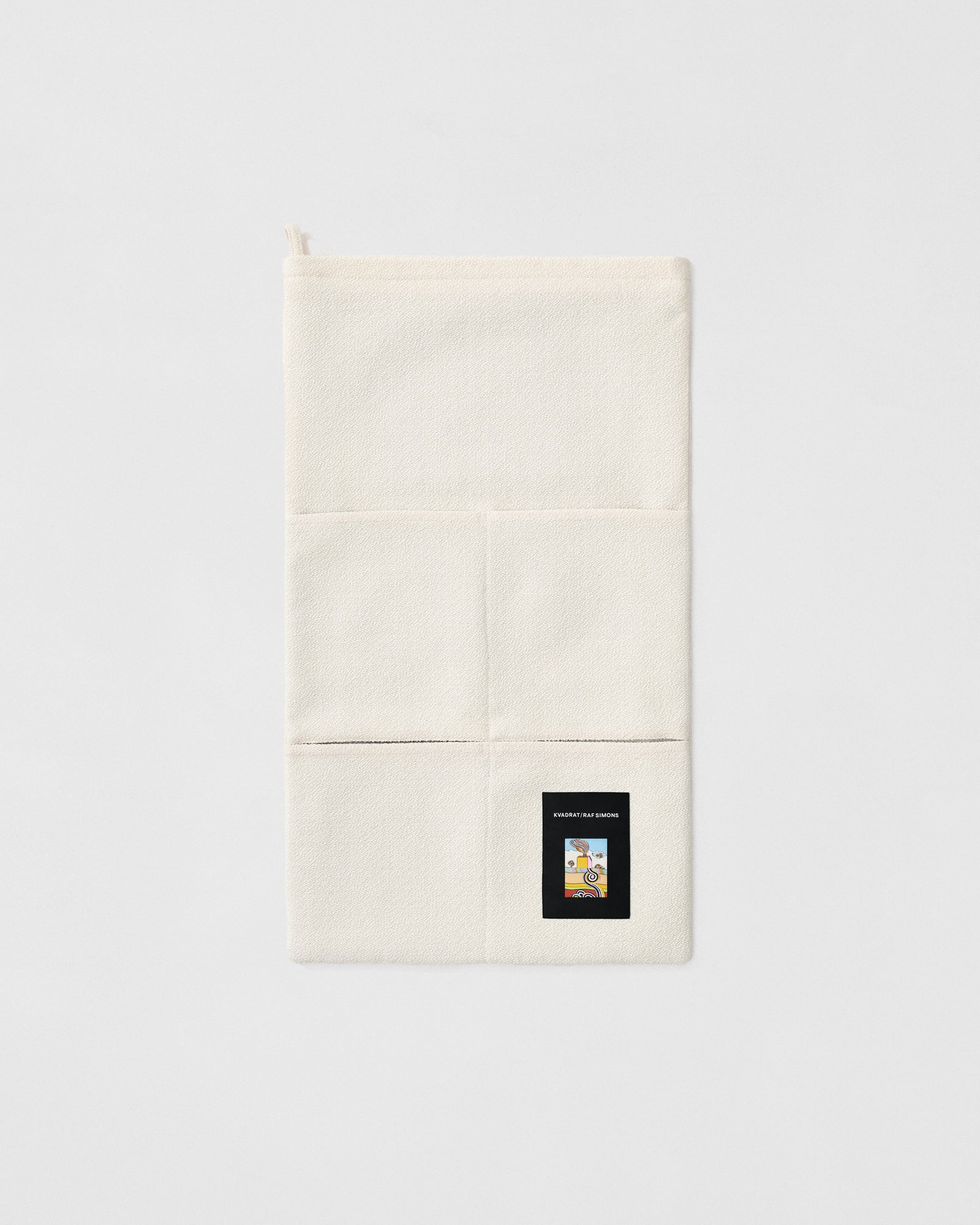 A clever mix of wall organiser and storage bag with four small pockets and one larger compartment. Designed to hold treasured items, it is both practical and imaginative, encouraging children to play and organise. The bag can be hung on the Shaker bar by a discreet loop or stand on the floor when filled. The small signature label connects it to the wider Kvadrat universe.