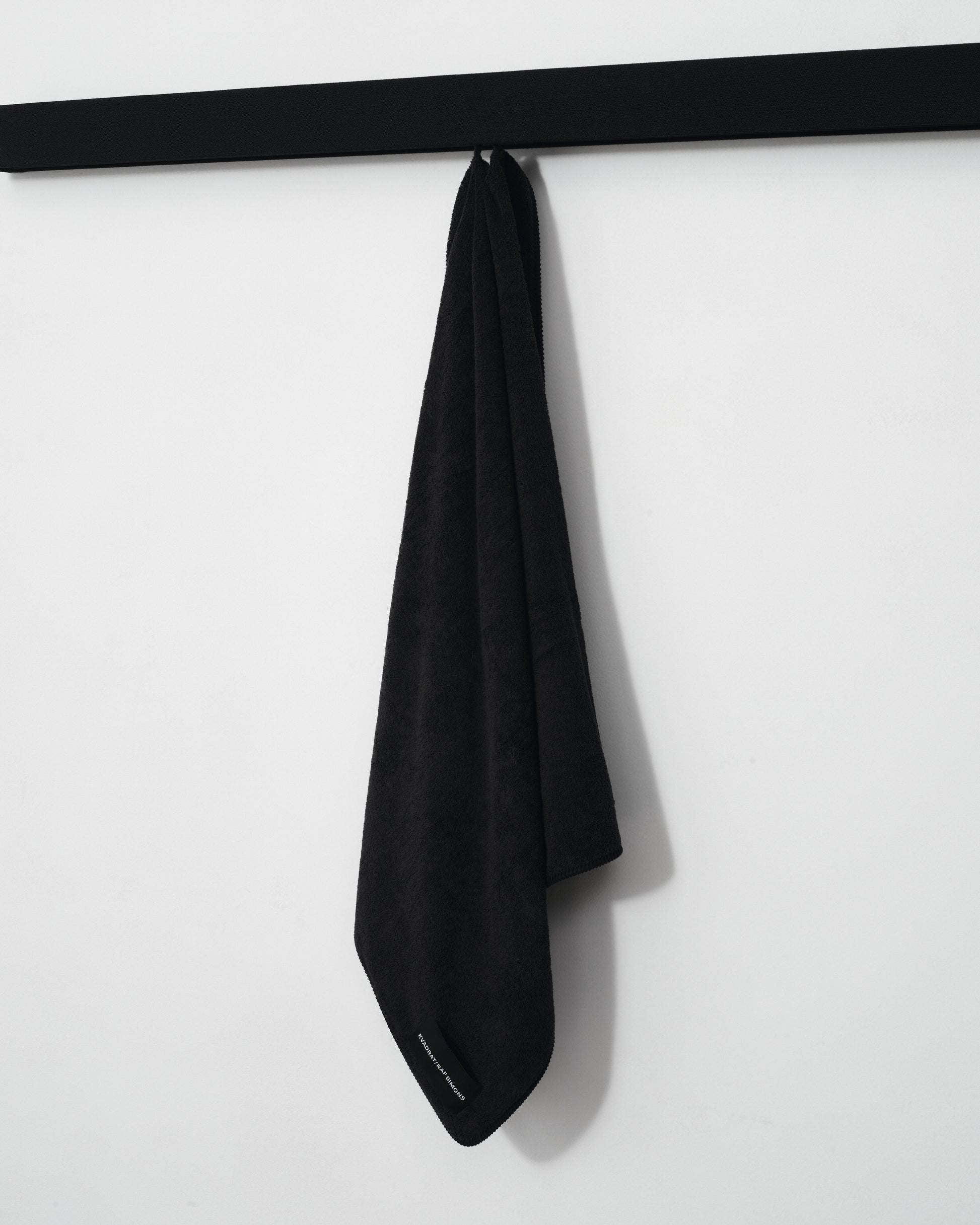 Towel in terry cotton with whipstitch detailing and rounded corners. Generously sized for wrapping the whole body.