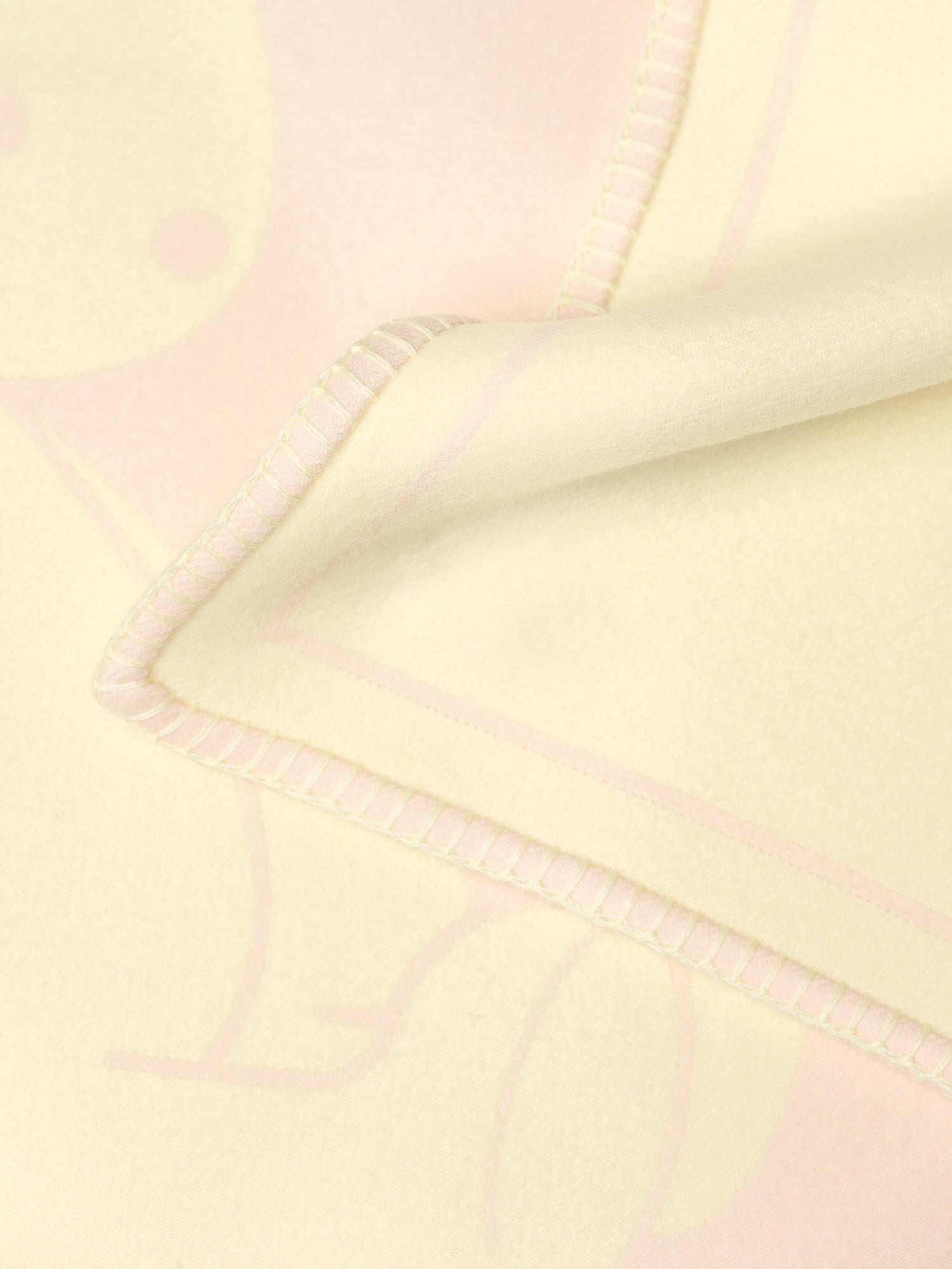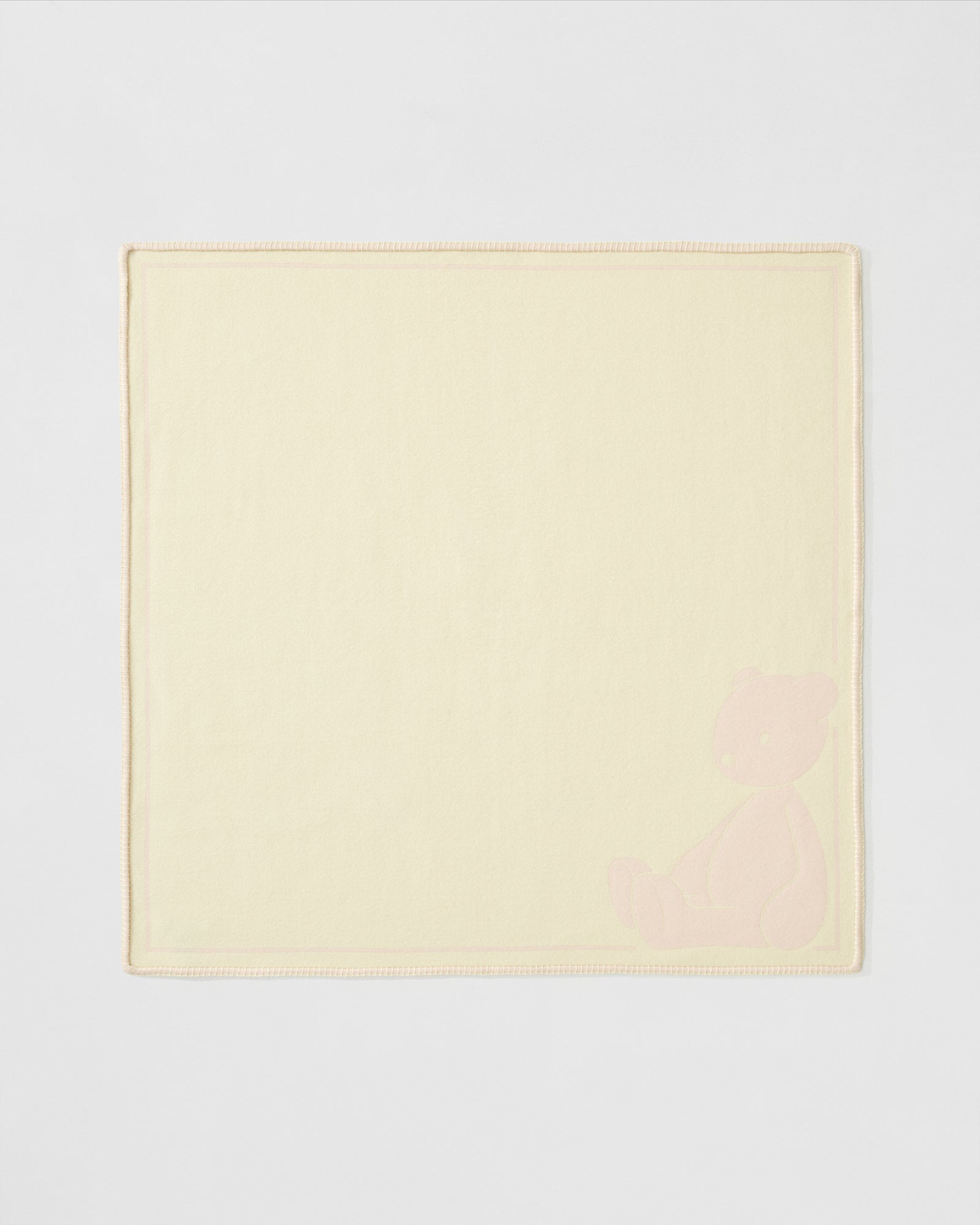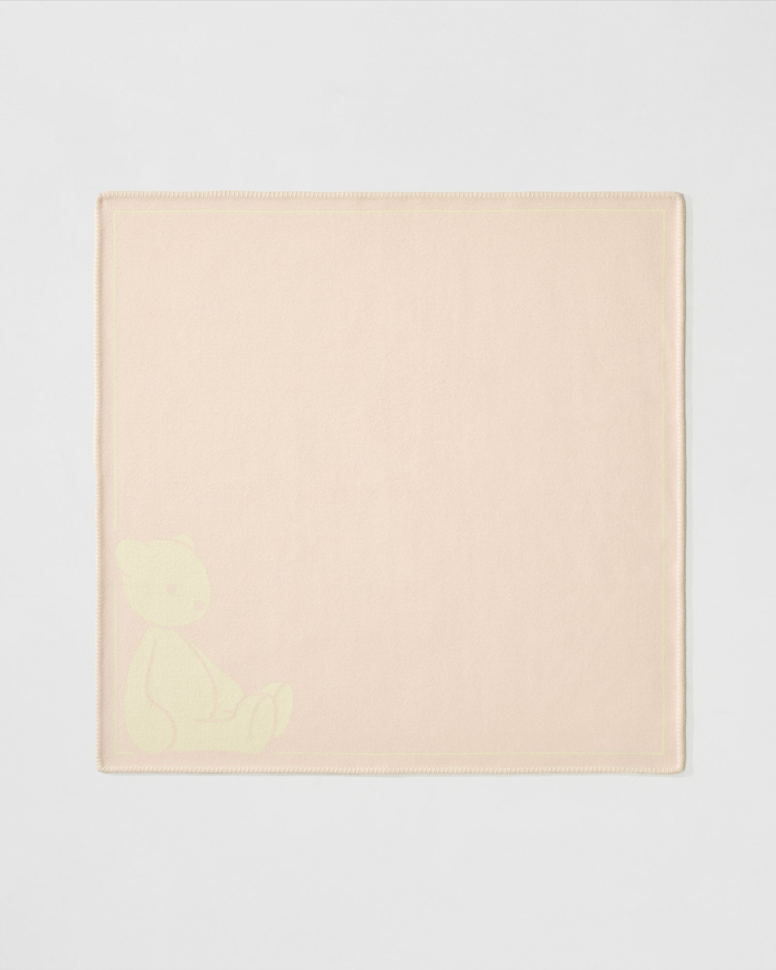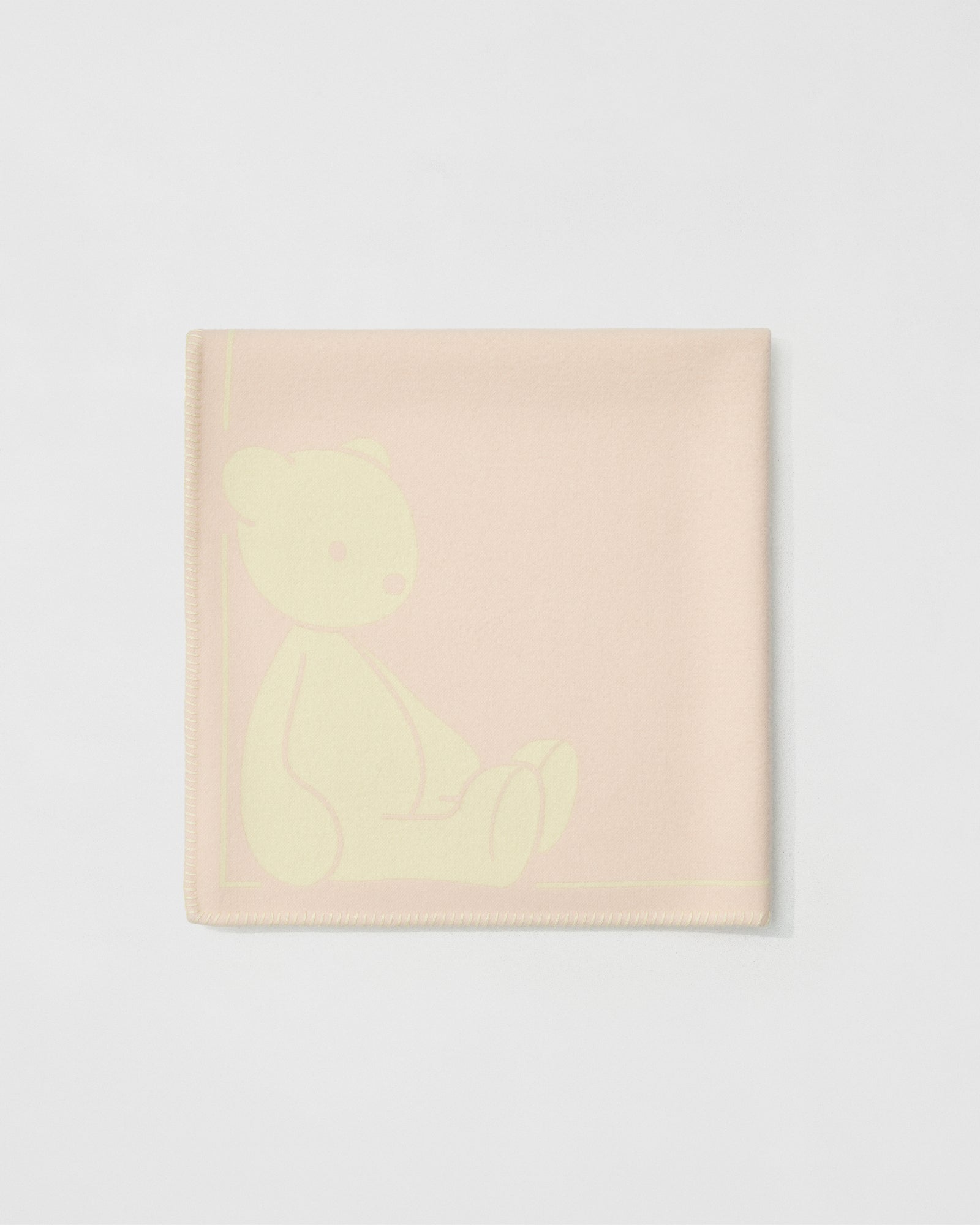 A kids blanket with a certain relaxed attitude, made in Italy in double faced jacquard wool with graphic expressions of a teddy bear and a bunny. Teddy sits upright and bunny hangs out. The special nature and feel of the blankets are accentuated by two colour combinations chosen by Raf Simons – peach and light yellow for the teddy and juxtaposed jade and desert sand for the bunny. Finished with whipstitch border and a Kvadrat/Raf Simons brand label. Can be used as a blanket, throw or a playmat on the floor.